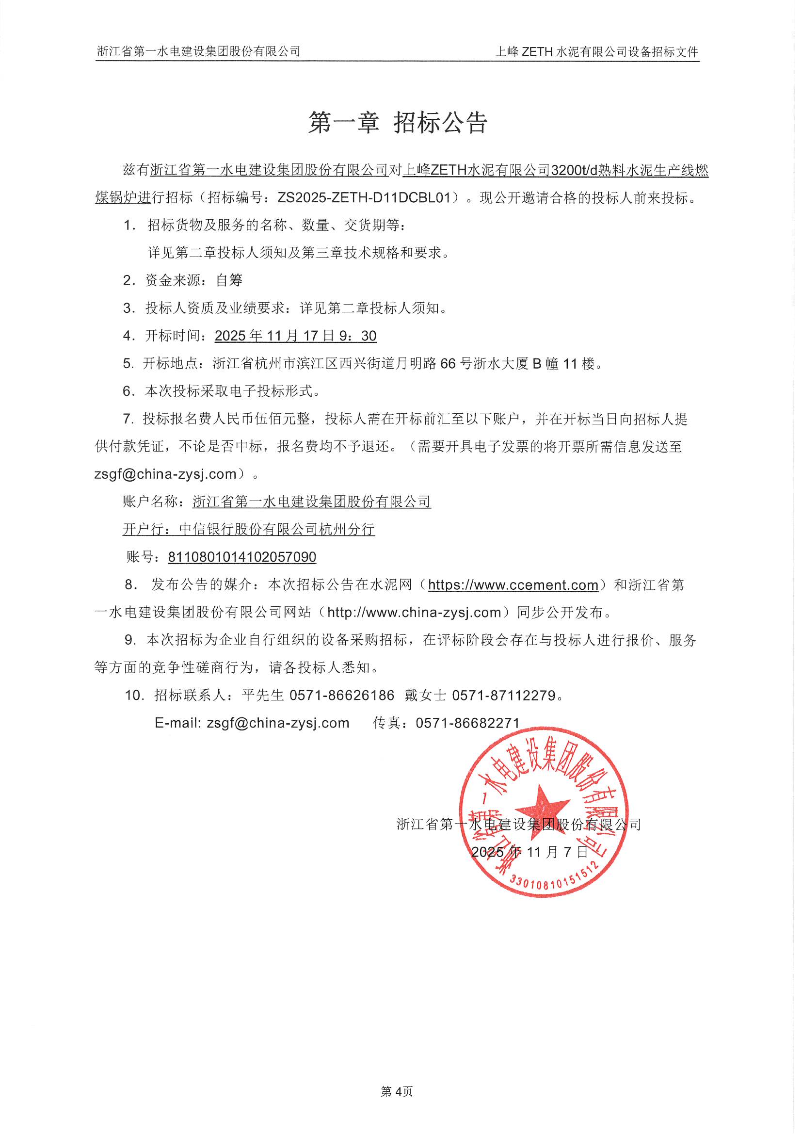 上峰ZETH水泥有限公司3200t/d熟料水泥生產(chǎn)線(xiàn)燃煤鍋爐招標(biāo)公告