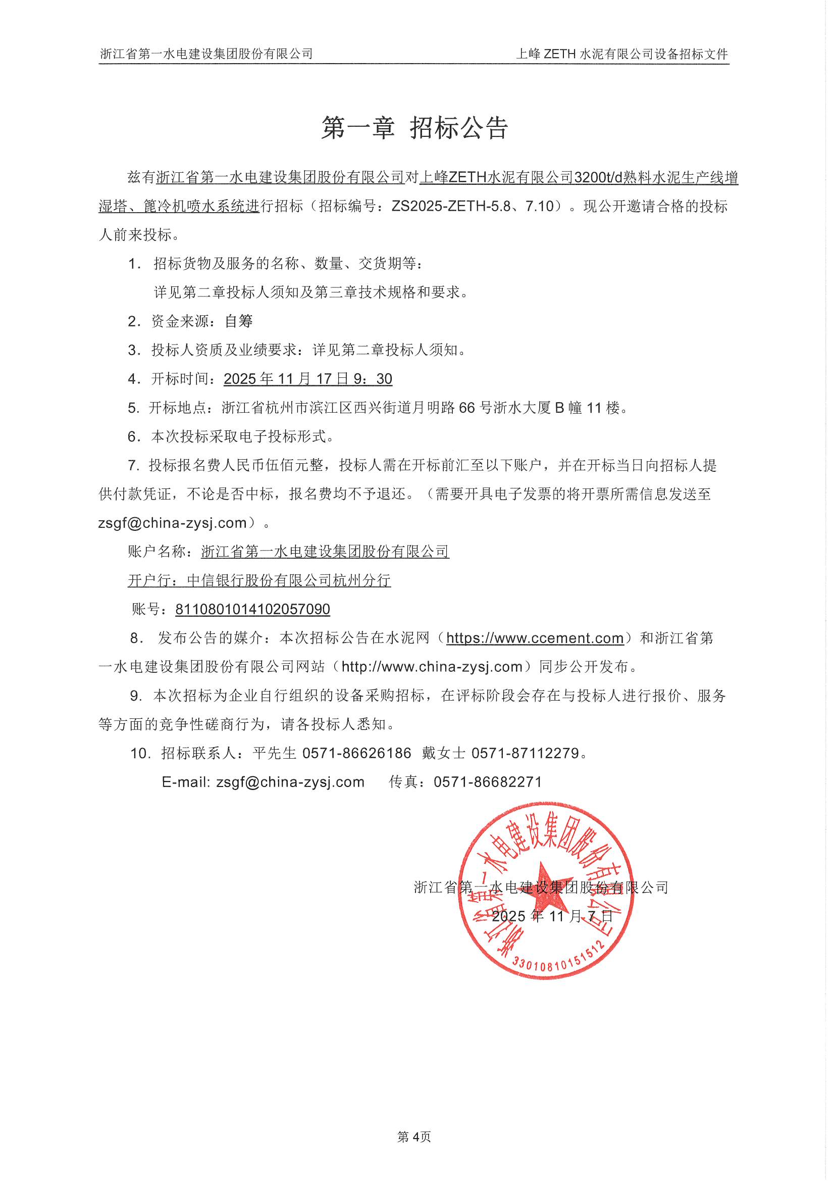 上峰ZETH水泥有限公司3200t/d熟料水泥生產(chǎn)線(xiàn)增濕塔、篦冷機(jī)噴水系統(tǒng)招標(biāo)公告
