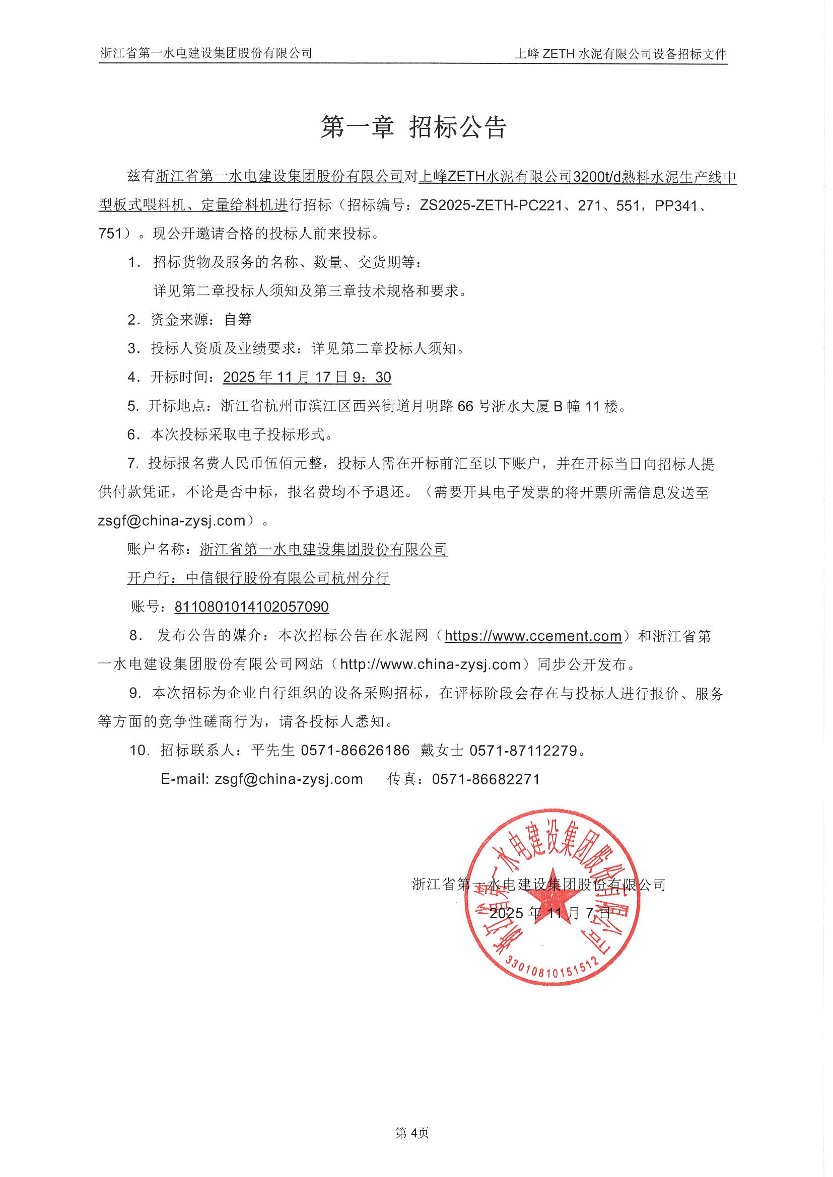上峰ZETH水泥有限公司3200t/d熟料水泥生產(chǎn)線(xiàn)中型板式喂料機(jī)、定量給料機(jī)招標(biāo)公告